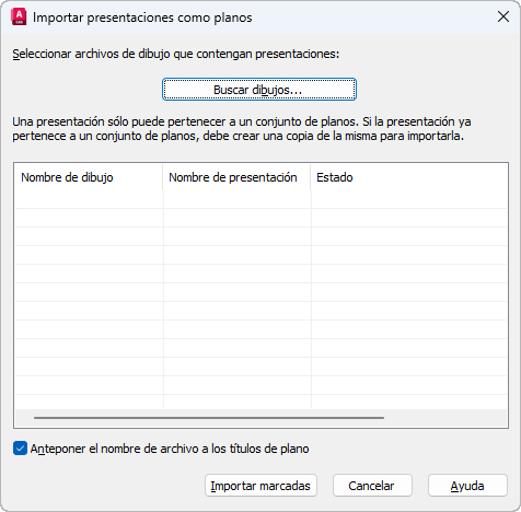 Muestra una lista de todas las presentaciones disponibles en el archivo de dibujo especificado. Active una casilla de selección para elegir una presentación.