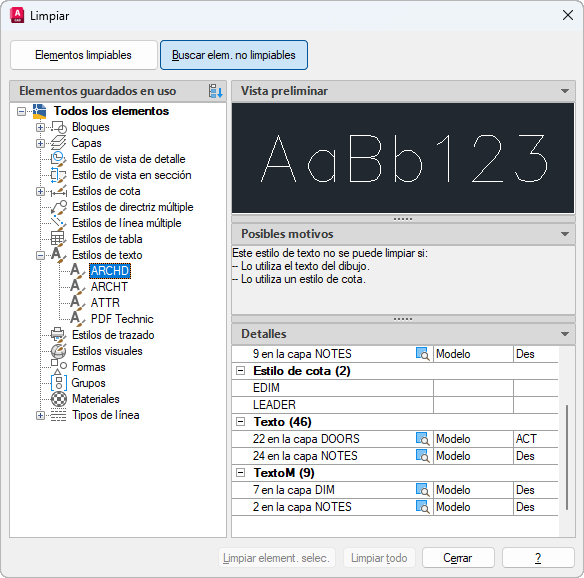 La mayoría de estos objetos se están utilizando actualmente en el dibujo o son objetos por defecto que no se pueden eliminar. Al seleccionar objetos guardados individuales, aparece información sobre los motivos por los que no se puede limpiar el elemento.