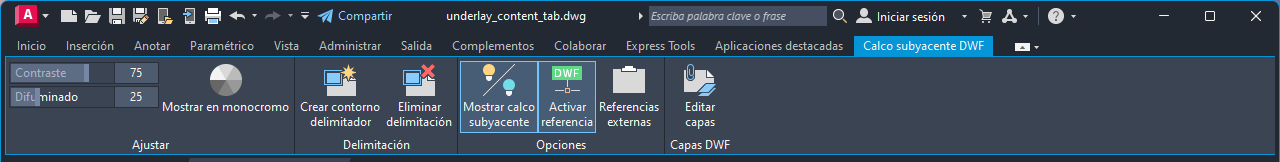 Al seleccionar un calco subyacente DWF en un dibujo, la ficha contextual Calco subyacente DWF aparece en la cinta de opciones.