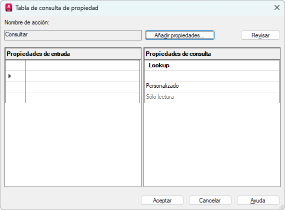 Muestra el valor personalizado asignado a las propiedades de entrada. Haga clic en la parte inferior de una columna de consulta para hacer que la propiedad de consulta sea de sólo lectura o para permitir la consulta inversa. La opción Permitir consulta inversa activa una lista desplegable asociada con el pinzamiento de consulta que cambia la referencia a bloque para que coincida con los valores de propiedad de entrada de la tabla.