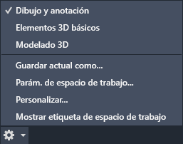 Los espacios de trabajo son un conjunto de menús, barras de herramientas, paletas y paneles de control de la cinta de opciones que se agrupan y organizan para que se pueda trabajar en un entorno de dibujo personalizado y orientado a tareas.