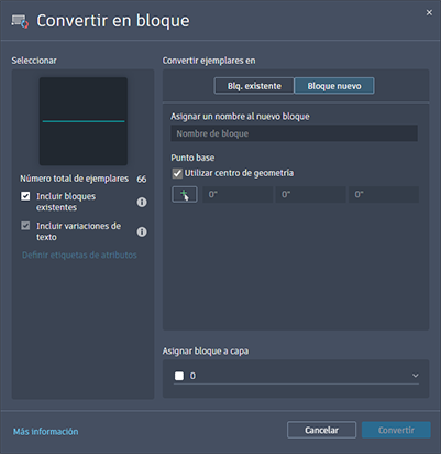 Al convertir la geometría o sus ejemplares en un bloque existente, puede elegir un bloque del dibujo actual seleccionándolo directamente. También puede elegir entre las siguientes opciones en el cuadro de diálogo Convertir: