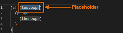 - Si el fragmento de código contiene un marcador de posición, escriba una expresión o un valor esperados. Pulse la tecla Tab para desplazarse al siguiente marcador de posición del fragmento de código si hay más de uno disponible.