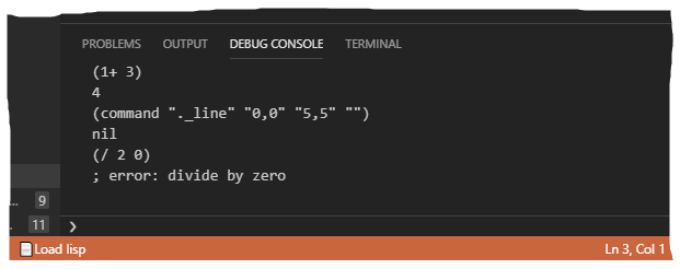When an instance of the AutoCAD application is attached to VS Code, you can enter and execute AutoLISP expressions in the Debug Console.