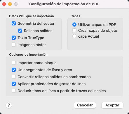 Establece las opciones para la importación de la geometría, los rellenos, las imágenes ráster y los objetos de texto TrueType desde un archivo o un calco subyacente PDF especificado.