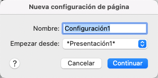 Especifica la configuración de página que se debe utilizar como punto de partida para la nueva configuración de página. Al hacer clic en Continuar, se muestra el cuadro de diálogo Configuración de página con los ajustes de la configuración de página seleccionada, que se pueden modificar si es necesario.