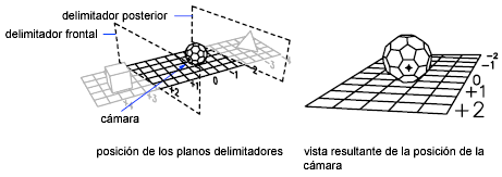 Puede delimitar las vistas del dibujo situando planos delimitadores frontales y posteriores que controlen la visibilidad de los objetos según la distancia a la que se encuentren de una cámara hipotética. Puede desplazar los planos delimitadores perpendicularmente a la línea de mira entre la cámara y el objetivo (hacia el lugar donde esta enfoca). La delimitación suprime la visualización de objetos desde los planos delimitadores frontal y posterior. En la siguiente ilustración, se explica cómo funcionan los planos delimitadores: