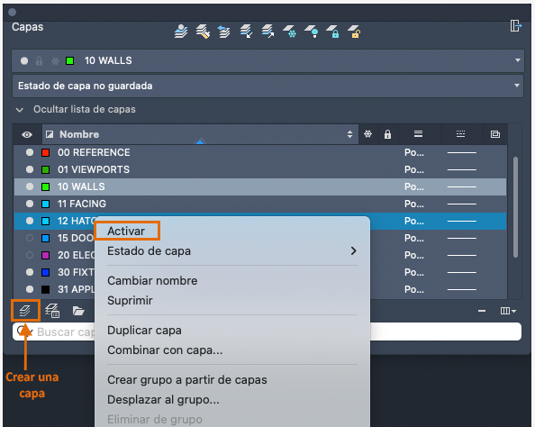Para crear una capa, haga clic en el botón que se muestra y escriba el nombre de la nueva capa. Para cambiar la capa actual, haga doble clic en el nombre de capa o haga clic con el botón derecho en el nombre de capa y seleccione Activar.