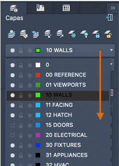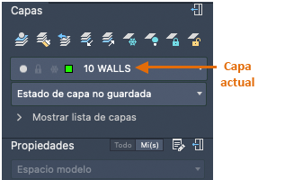 Las capas organizan el dibujo, lo que le permite suprimir temporalmente la visualización de los datos gráficos que no se necesiten. También puede asignar las propiedades por defecto, como el color y el tipo de línea, a cada capa.