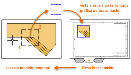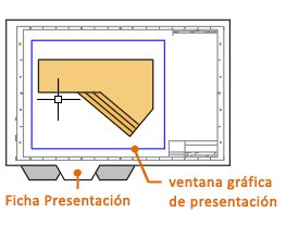 Una ventana gráfica de presentación es un objeto que se crea en una ficha Presentación para visualizar una vista con la escala ajustada del espacio modelo. Se puede considerar como un monitor de un circuito cerrado de televisión que muestra parte del espacio modelo. Puede seleccionar una ventana gráfica de presentación como lo haría con cualquier otro objeto. Cuando se selecciona, se muestran varios pinzamientos que permiten ajustar el tamaño de la ventana gráfica, desplazar la ventana y especificar la escala de la vista incluida en ella.