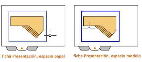 Si trabaja en una ficha Presentación, puede alternar entre el espacio papel y el espacio modelo sin volver a la ficha Modelo. A continuación se muestra cómo hacerlo. Como se muestra en la ilustración, desplace el cursor y haga doble clic dentro de una ventana gráfica de presentación para acceder al espacio modelo o haga doble clic fuera de ella para volver al espacio papel. En el espacio modelo, el borde de la ventana gráfica de presentación se vuelve más grueso.