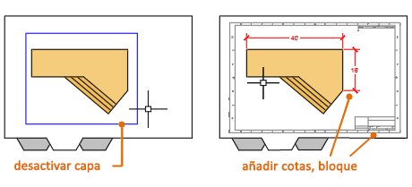 Después de crear una o varias ventanas gráficas de presentación con la escala ajustada en una ficha Presentación, siga estos pasos para utilizar el método transespacial para incluir anotaciones en el dibujo: