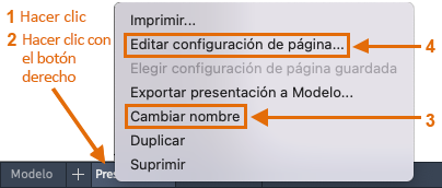 Lo primero que debe hacer al acceder a una ficha Presentación (1) es hacer clic con el botón derecho en la ficha (2) y cambiar su nombre (3) por algo más específico que Presentación 1. Los nombres que hacen referencia a un tamaño ANSI o ISO específico podrían ser una buena opción.