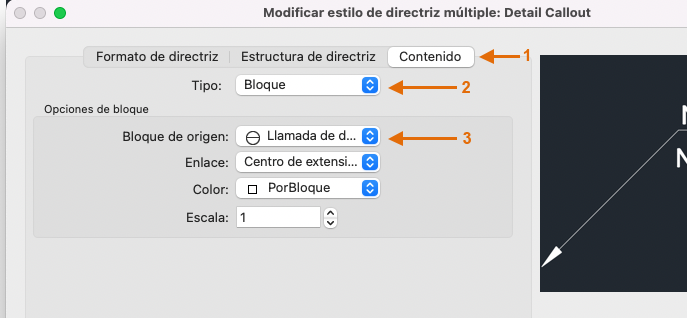 y elija un nombre descriptivo para el nuevo estilo de directriz múltiple. Haga clic en la ficha Contenido (1), seleccione Bloque (2) y, a continuación, Llamada de detalle (3), como se muestra.