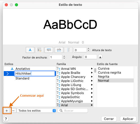 Al crear un estilo de texto nuevo, debe darle un nombre y, a continuación, seleccionar un tipo de letra y su estilo.