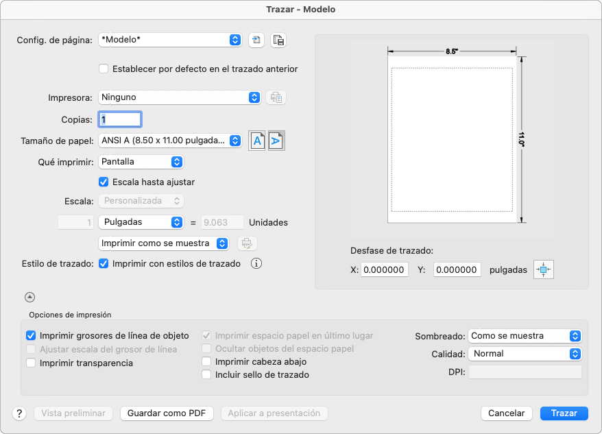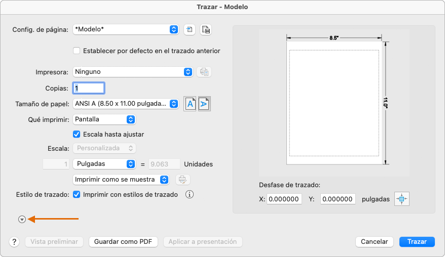 Para determinar si se muestran o se ocultan todas las opciones del cuadro de diálogo Trazar, haga clic en la flecha que se indica para expandirlas.