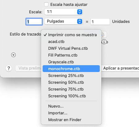 La tabla de estilos de trazado proporciona información acerca del procesamiento de colores. Los colores que se muestran correctamente en el monitor podrían no ser adecuados para un archivo PDF o para la impresión. Por ejemplo, es posible que desee crear un dibujo en color, pero generar una salida monocroma. A continuación, se muestra cómo especificar una salida monocroma: