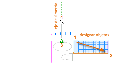 o escriba MI en la ventana de comandos), utilice una selección de ventana (1 y 2) para seleccionar la geometría en el muro derecho, pulse Intro o la barra espaciadora y, a continuación, especifique un eje de simetría (3 y 4) correspondiente a la línea de centro del cuarto de baño.