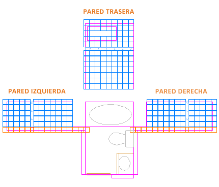La siguiente ilustración procede de un proyecto de losetas. Los muros del cuarto de baño residencial se aplanan para poder presentar el patrón de loseta y calcular el número de losetas necesarias.