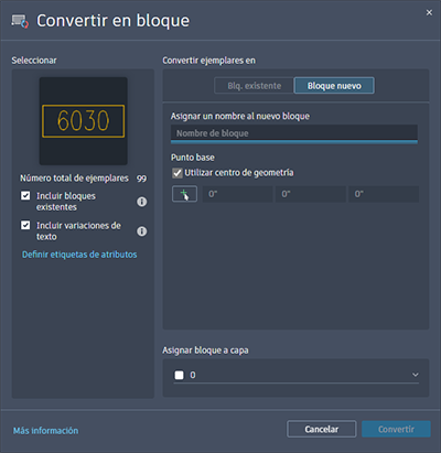 BUSCARBLOQ: muestra el cuadro de diálogo Convertir en bloque, que proporciona opciones para convertir las entidades seleccionadas y los ejemplares idénticos en bloques.