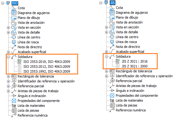 El cuadro de diálogo Parámetros de soldadura muestra las últimas revisiones de las normas ISO y JIS. Los símbolos de soldadura y de respaldo correspondientes también se enumeran en el Filtro de símbolo.