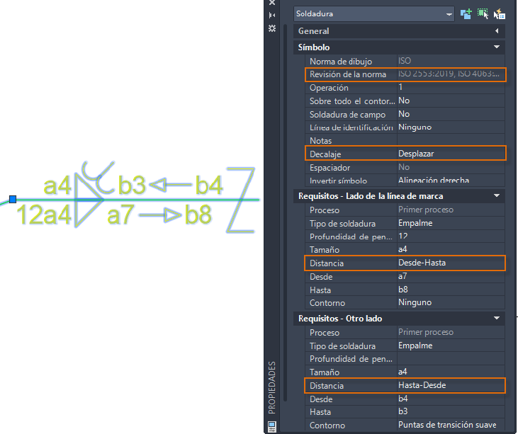 Puede ver y modificar todas las propiedades de los símbolos de soldadura en la paleta Propiedades.