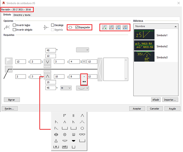Además, el cuadro de diálogo Símbolo de soldadura JIS incluye un nuevo espaciador y controles para la compatibilidad con líneas de varias referencias.