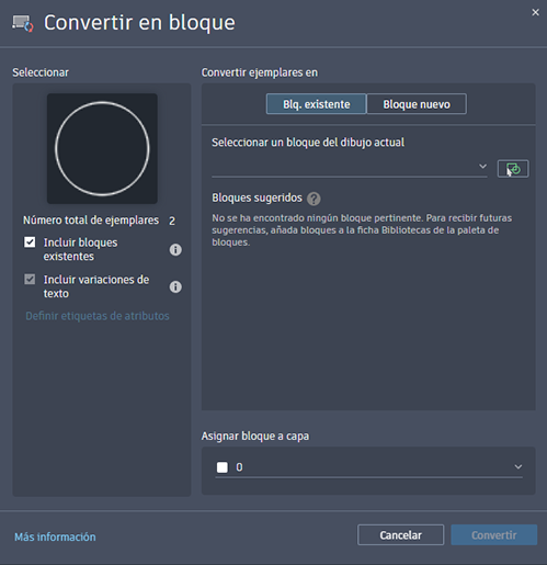 BUSCARBLOQ: reemplaza a CONVABLOQ. Muestra el cuadro de diálogo Convertir, que proporciona opciones para convertir las entidades seleccionadas y los ejemplares idénticos en bloques.