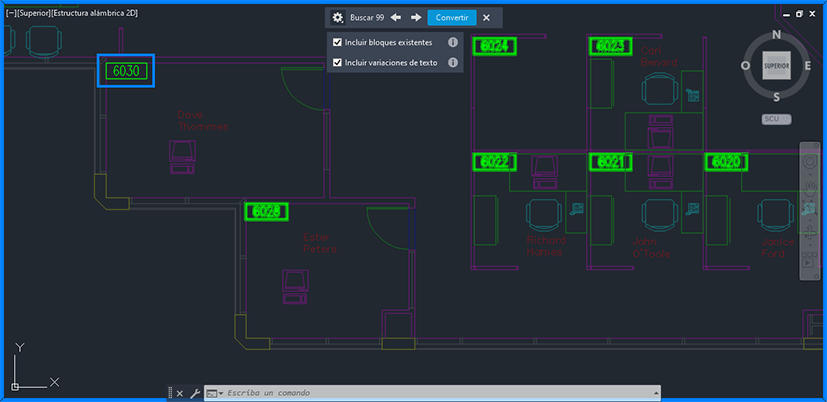 Con esta versión, la función Buscar y convertir también busca variaciones de texto para convertirlas en atributos de bloque. Esta nueva función es útil para clasificar tipos de texto repetitivos, pero variables, como los nombres y los números de habitaciones de hotel.