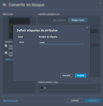 Además de convertir ejemplares coincidentes en un bloque, puede especificar etiquetas de atributo para variaciones de texto. Para ello, haga clic en Definir etiquetas de atributos.