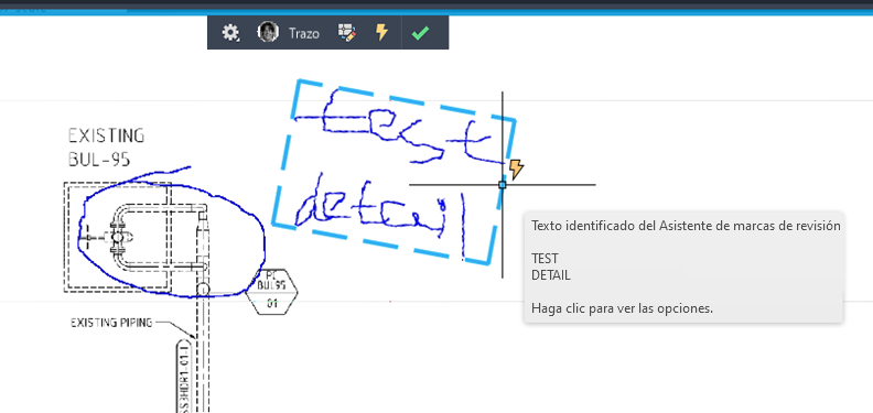 El Asistente de marcas de revisión identifica automáticamente las marcas de revisión como texto, directrices y nubes de revisión. Haga clic en una marca de revisión identificada y, a continuación, insértela como un objeto de textoM, directriz múltiple o nube de revisión. Puede editar el texto antes de insertarlo o copiar el texto en el portapapeles.