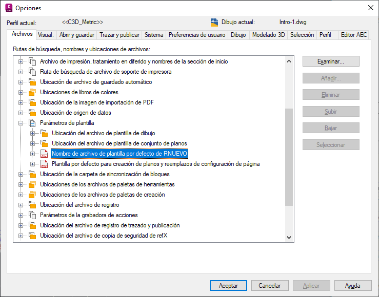 Cuando se inicia Autodesk Civil 3D con el perfil de medidas imperiales, la plantilla por defecto para un nuevo dibujo es _Autodesk Civil 3D (Imperial) NCS.dwt. Cuando se inicia Autodesk Civil 3D con el perfil de medidas métricas, la plantilla por defecto para un nuevo dibujo es _Autodesk Civil 3D (Metric) NCS.dwt. La plantilla por defecto se aplica al iniciar Autodesk Civil 3D o al crear un nuevo dibujo (comando RNUEVO). Puede especificar una plantilla por defecto diferente que se adapte mejor a sus necesidades.