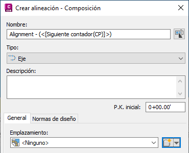 Cuando se crea una alineación mediante los cuadros de diálogo Crear alineación - Composición o Crear alineación - A partir de polilínea, el valor por defecto crea la alineación sin ningún emplazamiento especificado (<Ninguno>), tal como se muestra en la figura 2.