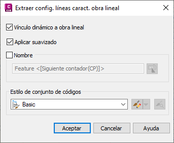 Una práctica recomendada es seleccionar la opción Vínculo dinámico en el cuadro de diálogo Extraer configuración de líneas características de obra lineal, como se muestra en la figura 35, de manera que en este ejemplo todas las actualizaciones en la obra lineal actualizarán también la explanación de esta área. Además, existen parámetros de suavizado para tratar la formación de la línea característica conforme ésta recorre un área curva. Para obtener más información, consulte Suavizado de líneas características.