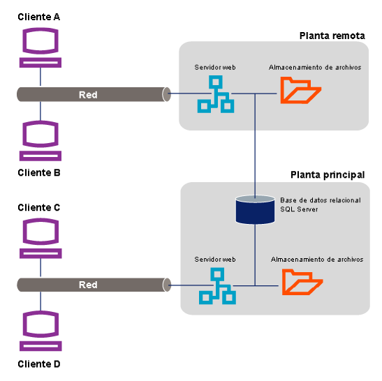 Como se muestra en la figura 6, la instalación de varios emplazamientos de Vault utiliza una única instancia de SQL Server para gestionar los archivos de dos o más emplazamientos. Cada base de datos —también denominada almacén— se replica en cada emplazamiento para facilitar el uso compartido de los archivos, pero no se copian todos los archivos. Los archivos se distribuyen a los usuarios a medida que estos los necesitan. SQL Server realiza un seguimiento de dónde existen copias de archivos y garantiza que se actualicen o que se notifiquen los cambios a los usuarios. Las tareas de administración de base de datos de toda la red se pueden administrar desde cualquier ubicación.