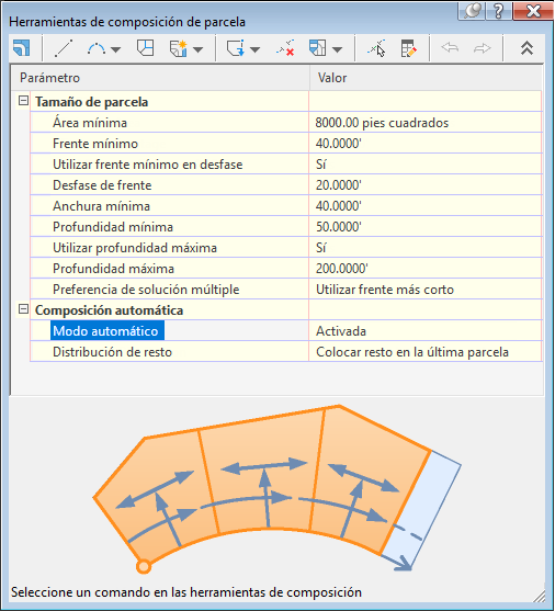 Puede utilizar las herramientas de composición de parcela para dividir parcelas existentes de forma automática o semiautomática. El modo automático permite utilizar las herramientas de composición de parcela para componer automáticamente varias parcelas nuevas, y ofrecer una vista preliminar de ellas, que ocuparán la zona disponible. Si desactiva el modo automático, las herramientas de composición compondrán las parcelas nuevas propuestas de una en una.