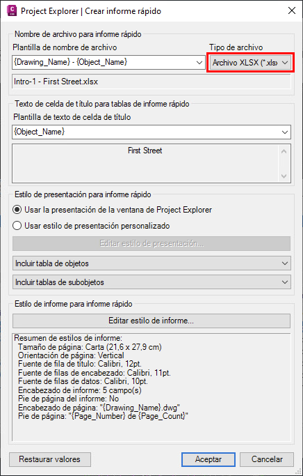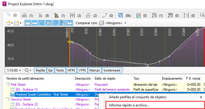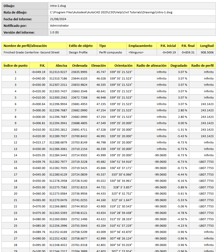 En este aprendizaje se muestra el uso de Project Explorer para generar un informe sencillo de Alineación/Perfil de Civil 3D en un archivo PDF. A continuación, va a escribir el mismo informe en un archivo XLSX de Excel.