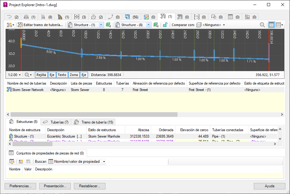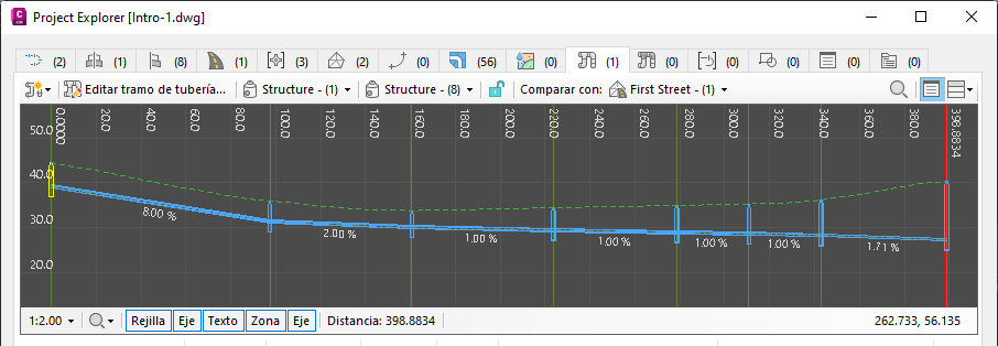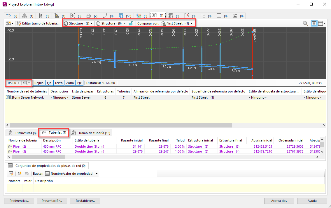 Project Explorer permite ajustar la pendiente de todo un conducto de tubería en una sola operación. Intentémoslo ahora: