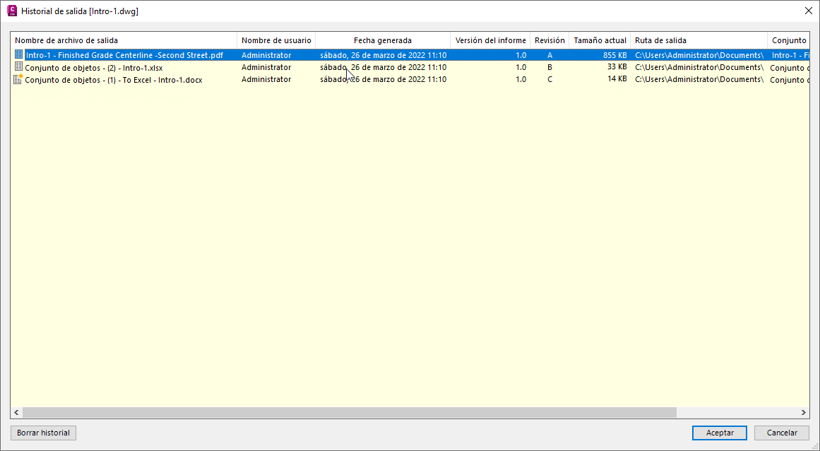 En este cuadro de diálogo es posible ver la ruta y el nombre del archivo de salida de cada informe generado, junto con la fecha de creación del archivo y el nombre del usuario que generó el informe.