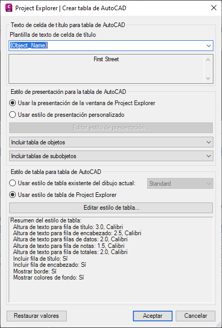 Para volver a utilizar el estilo de tabla de AutoCAD creado para la tabla de alineación, asegúrese de que esté seleccionada la opción Usar estilo de tabla existente del dibujo actual y seleccione Project Explorer - (1) en la lista de estilos de tabla existentes.
