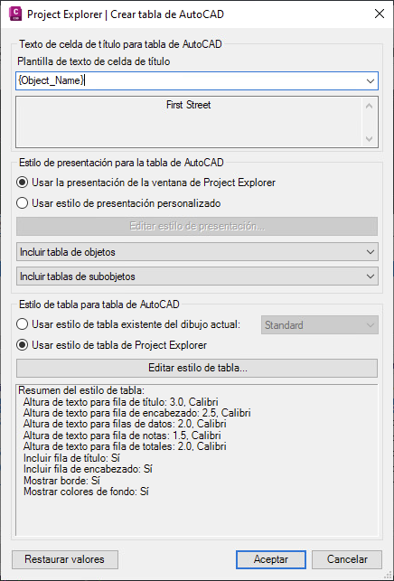 Tenga en cuenta que la fila de título de la tabla de AutoCAD se puede derivar de una serie de variables dinámicas durante el proceso de creación. O bien, se puede especificar un nombre de archivo fijo en este cuadro de diálogo. Por defecto, la fila de título mostrará el nombre del objeto seleccionado.