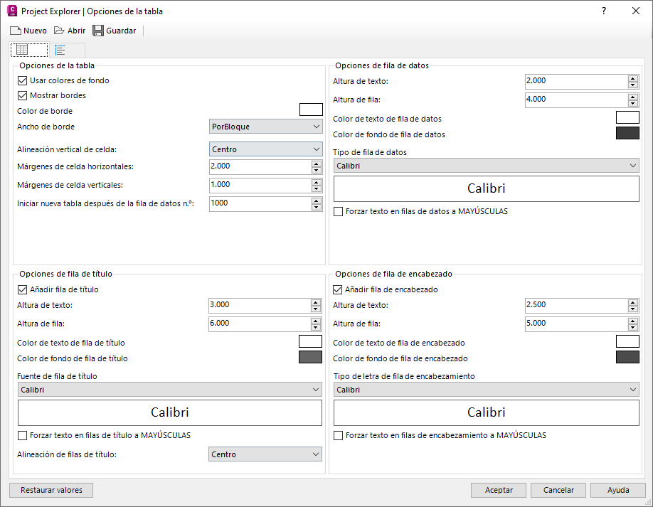 En el cuadro de diálogo Crear tabla de AutoCAD, compruebe que la opción Utilizar estilo de tabla de Project Explorer esté seleccionada y, a continuación, haga clic en el botón Editar estilo de tabla. Se abrirá el cuadro de diálogo Opciones de tabla. Este cuadro de diálogo permite definir el aspecto que tendrá la tabla.
