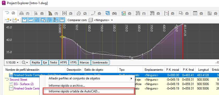 En este aprendizaje se muestra el uso de Project Explorer para insertar dos tablas estáticas de AutoCAD en un dibujo de Civil 3D. La primera tabla contendrá un informe sencillo de alineación/perfil de Civil 3D. La segunda tabla contendrá un informe de conductos de tubería derivado de una red de tuberías de Civil 3D.