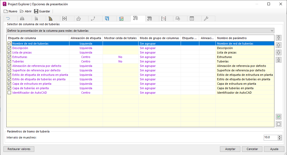 En la vista de lista, asegúrese de que solo estén marcadas las siguientes columnas: Distancia, Nombre de pieza, Abscisa, Ordenada, Salida de elevación invertida, Elevación invertida, Entrada de elevación invertida, Comparar con, Elevación comparada, Desfase comparado (Z).