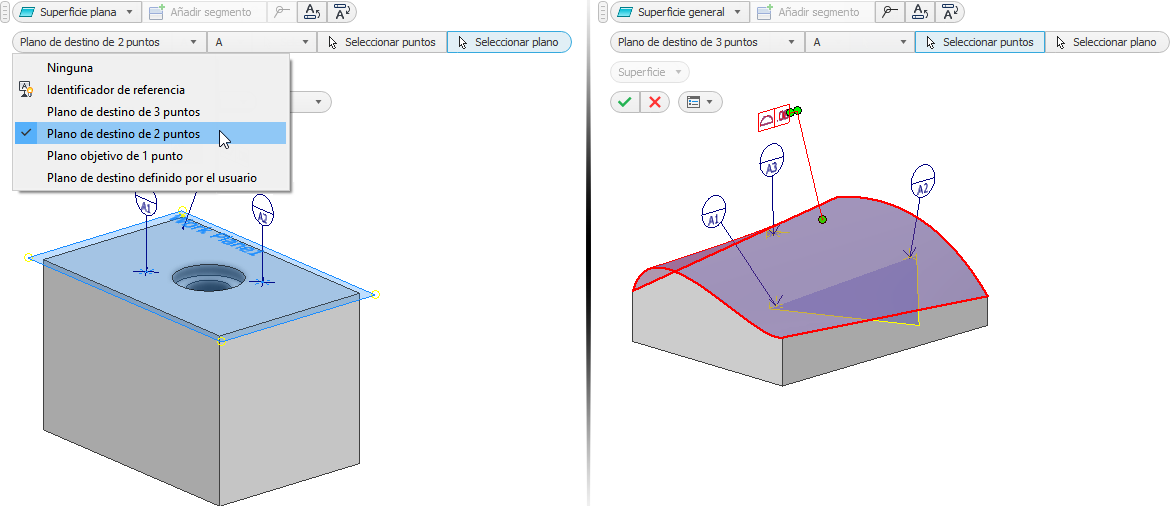 Puede crear objetivos de referencia seleccionando una de las opciones de la lista desplegable. Por ejemplo, la imagen siguiente de la izquierda crea referencias parciales mediante dos puntos de boceto 2D y un plano de trabajo. La imagen de la derecha utiliza tres puntos de trabajo y un plano de trabajo.