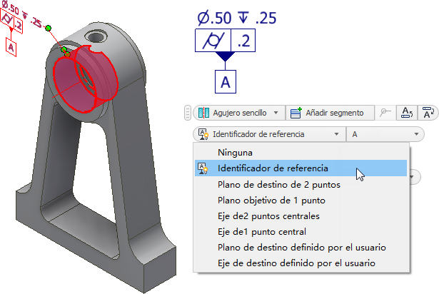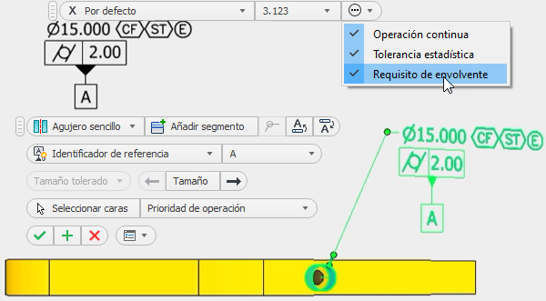 La barra de herramientas pequeña incluye una vista preliminar interactiva de la anotación de tolerancia. La barra de herramientas pequeña incluye opciones para seleccionar el tipo de operación o geometría, asociar un identificador de referencia o añadir una fila al rectángulo de tolerancia. En los cuadros de lista se recogen las opciones adecuadas para la operación o geometría seleccionada.