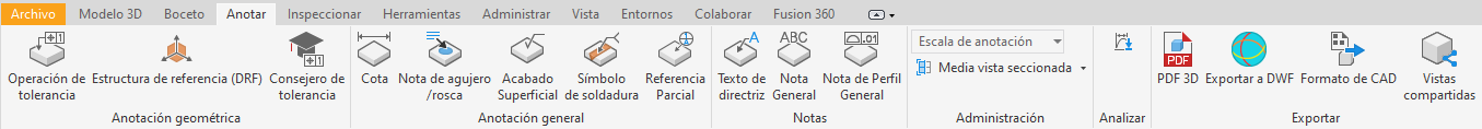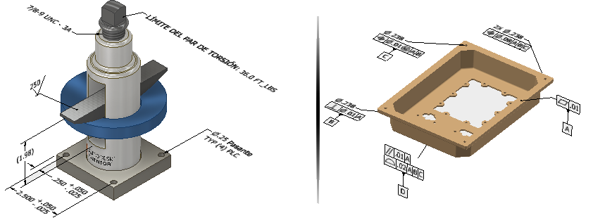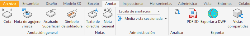 Utilice los comandos disponibles en la ficha Anotar de un archivo de pieza o de ensamblaje para añadir anotaciones 3D al modelo.