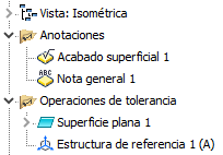 Una carpeta del navegador muestra todas las anotaciones (piezas y ensamblajes) y operaciones de tolerancia (solo piezas) en el archivo. El resaltado transversal entre la ventana gráfica y el navegador se encuentra disponible para las operaciones de anotaciones y tolerancia.