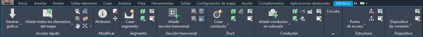 Al iniciar la aplicación y abrir un proyecto en el módulo de componentes eléctricos de Europa Central o América del Norte, se muestra una ficha con una cinta de opciones para componentes eléctricos.