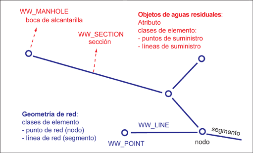 El módulo de aguas residuales se basa en el modelo de datos de suministro, que almacena por separado la geometría y los datos de los atributos. El modelo de datos contiene argumentos, representaciones, dominios, suministros, topologías e intersecciones.